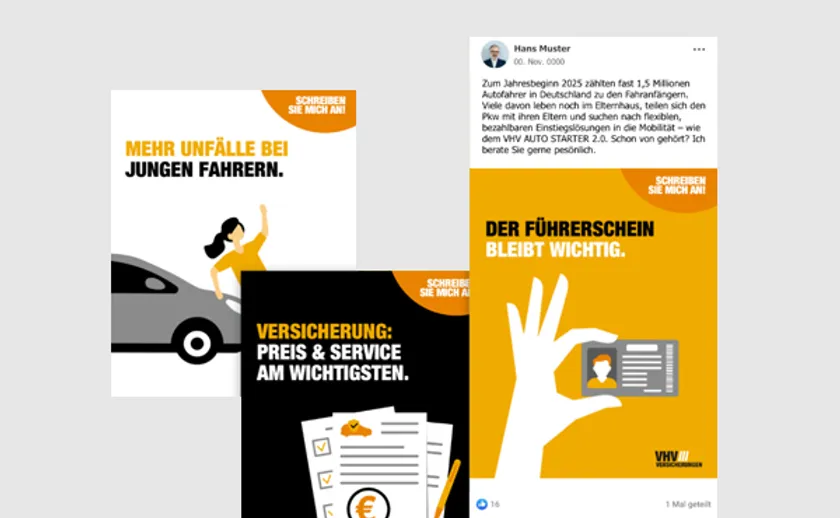 Oft übernehmen zunächst die Eltern die Organisation des Versicherungsschutzes für ihre Kinder. Mit zunehmendem Alter wächst jedoch auch bei den Fahranfängern selbst das Interesse an passenden Versicherungslösungen. Nutzen Sie unsere vorbereiteten Social-Media-Vorlagen, um diese Zielgruppe gezielt zu erreichen und gleichzeitig Ihre Beratungsleistung sichtbar zu machen.