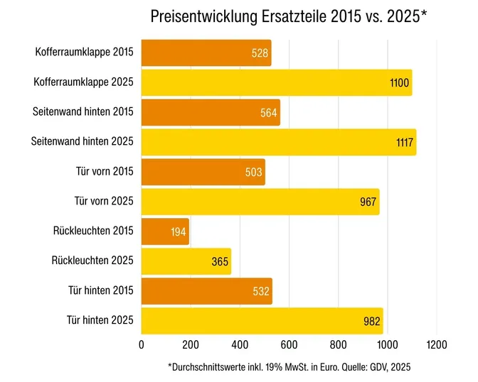 Ein Blick auf die langfristige Entwicklung macht den Trend besonders deutlich: Zwischen 2015 und 2025 sind die Kosten für Autoersatzteile deutlich stärker gestiegen als die allgemeine Inflation. Während der Verbraucherpreisindex seit Anfang 2015 um knapp 30 Prozent zugelegt hat, sind die Preise für viele Ersatzteile um mehr als 80 Prozent nach oben gegangen. Im Vergleich dazu blieben die Beiträge für eine Kfz-Haftpflichtversicherung mit einem Anstieg von rund 23 Prozent moderat.